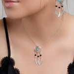 Handcrafted in 925 silver it showcases an intricate webbed core with a single vibrant Turquoise stone at the centre. Finished with 3 hanging individual delicate feathers adorned with Onyx stone beads. Complete with a solid silver chain, this necklace is a symbol of protection and hope.