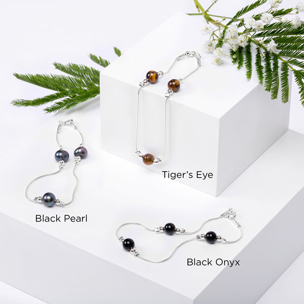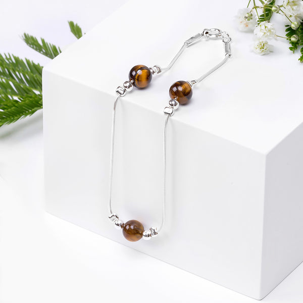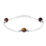 Handcrafted in 925 silver with 3 natural Tiger's Eye gemstones spaced evenly across a solid silver snake chain. Finished with miniature silver balls either side of each stone to complete this must have jewellery staple.