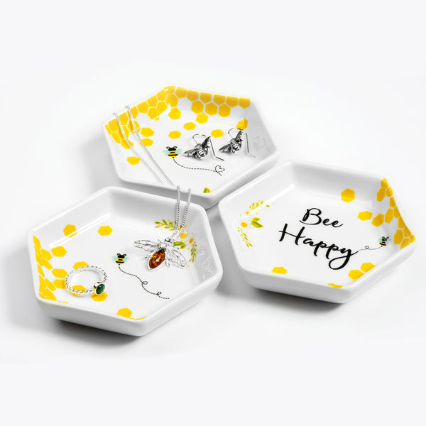 Each of our "Bee Happy" Trinket Dish is sold in a set of 3 that fit together to resemble a sweet honeycomb. They are made of the highest quality ceramic with individual painted designs.
