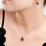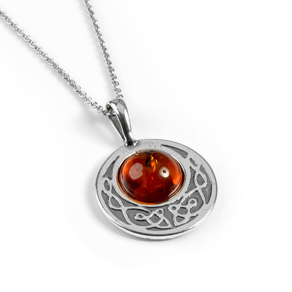Crafted in 952 silver, this circle shaped pendant is adorned with a genuine Baltic Amber gemstone at the centre. With a Celtic inspired detailing around the stone, it is unique and elegant. Complete with a solid silver chain, it will be sure to compliment any outfit.