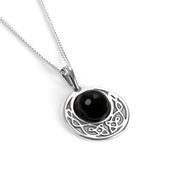 Crafted in 952 silver, this circle shaped pendant is adorned with a Black Onyx gemstone at the centre. With a Celtic inspired detailing around the stone, it is unique and elegant. Complete with a solid silver chain, it will be sure to compliment any outfit.