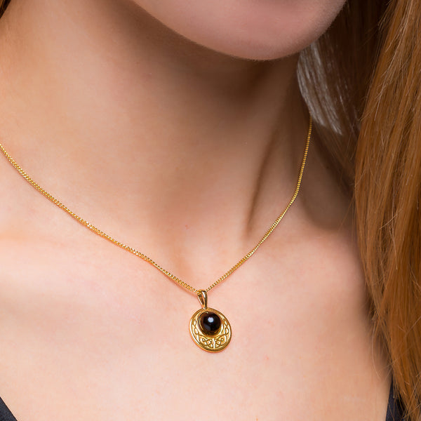 Crafted in 952 silver with 24ct Gold plating, this circle shaped pendant is adorned with a Black Onyx gemstone at the centre. With a Celtic inspired detailing around the stone, it is unique and elegant. Complete with a solid silver gold plated chain, it will be sure to compliment any outfit.