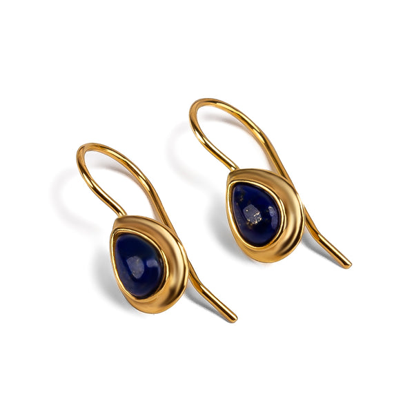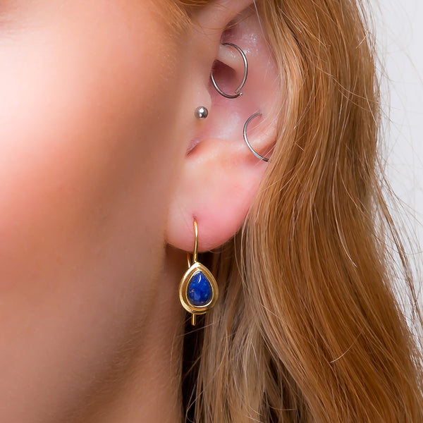 Crafted in solid 925 silver with 24ct Gold plating, each earring has a single teardrop shaped natural Lapis Lazuli gemstone. With a solid open hook and delicate design, these earrings are ideal for all day wearing.