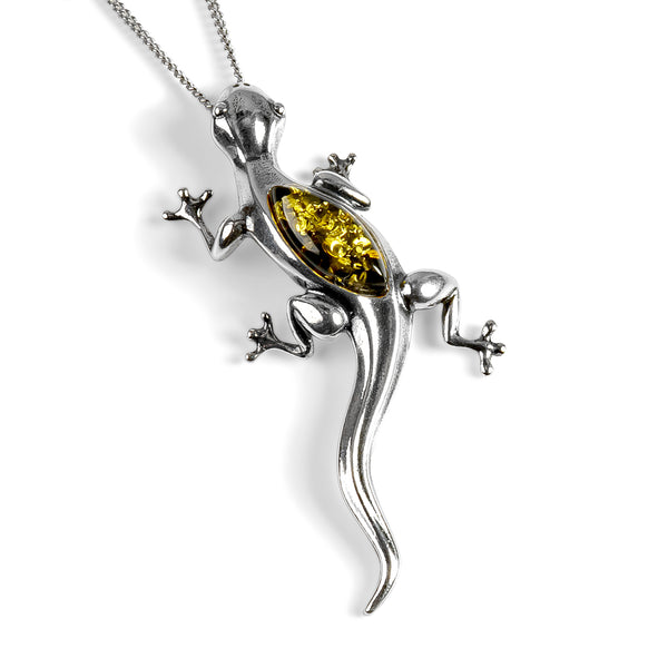 Large Lizard Gecko Necklace in Silver and Green Amber
