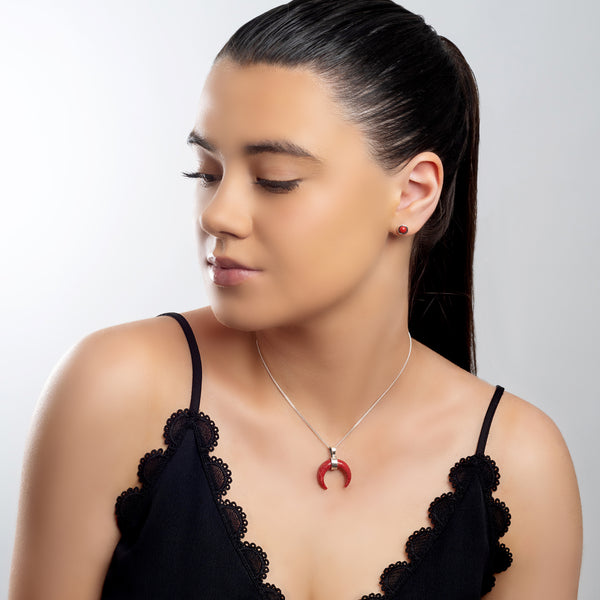 Feel empowered with our Silver and Red Horn Coral Crescent Moon Necklace.