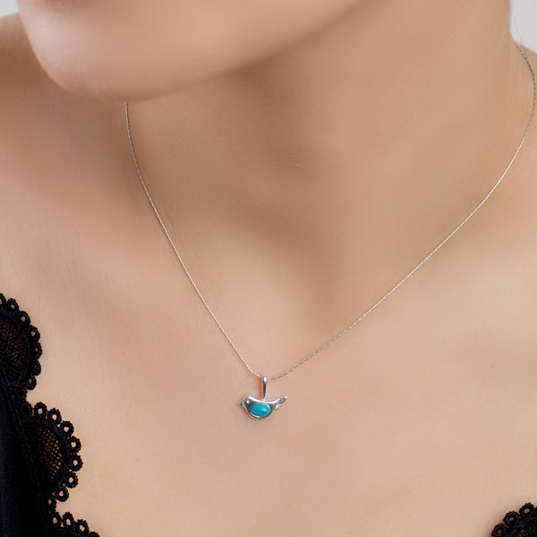 Crafted in 925 silver and adorned with a single vibrant Turquoise stone at the heart of this sweet birdie. Complete with a solid silver chain, it can be styled with other necklaces for an on-trend look.