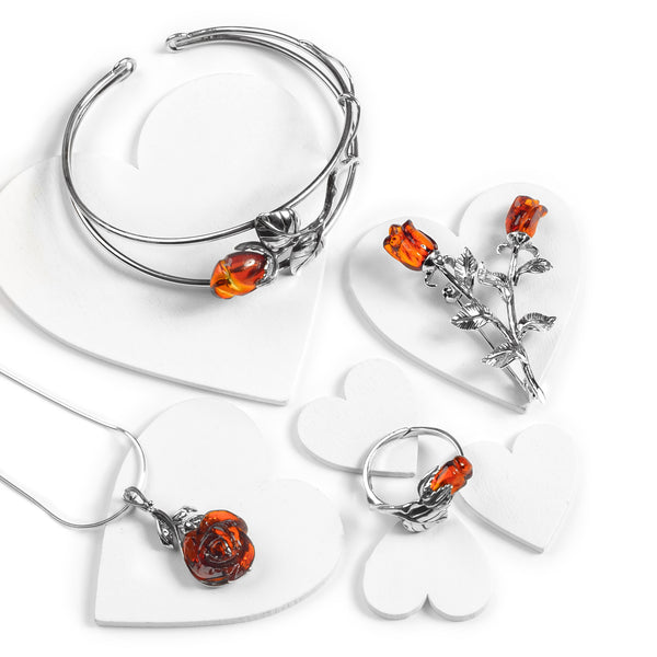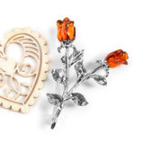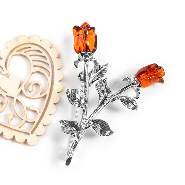 Handcrafted in 925 Silver, this unique brooch comprises two genuine Baltic Amber gemstones which have been carefully carved into beautiful rose buds. Sitting proudly on the detailed solid silver stem complete with leaves and thorns to really bring this brooch to life.