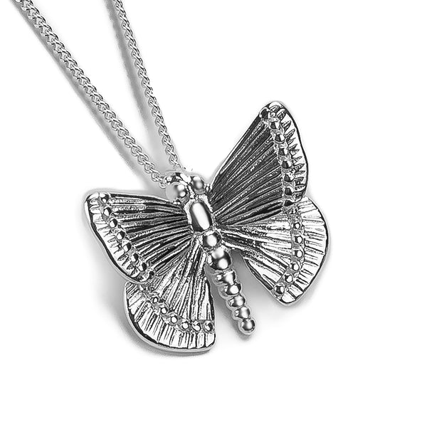 Inspired by the many British species of Butterfly, this necklace has been lovingly crafted in solid 925 silver with extra detailing on the wings and body to bring this unique creature to life. With a curb silver chain, this necklace is stylish and sophisticated.