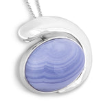 Meticulously crafted in 925 sterling silver, this designer piece combines a substantial oval Blue Lace Agate gemstone with sophisticated silverwork detailing that frames the stone with understated luxury. The accompanying solid silver chain is available in your preferred length, offering versatility for any occasion.