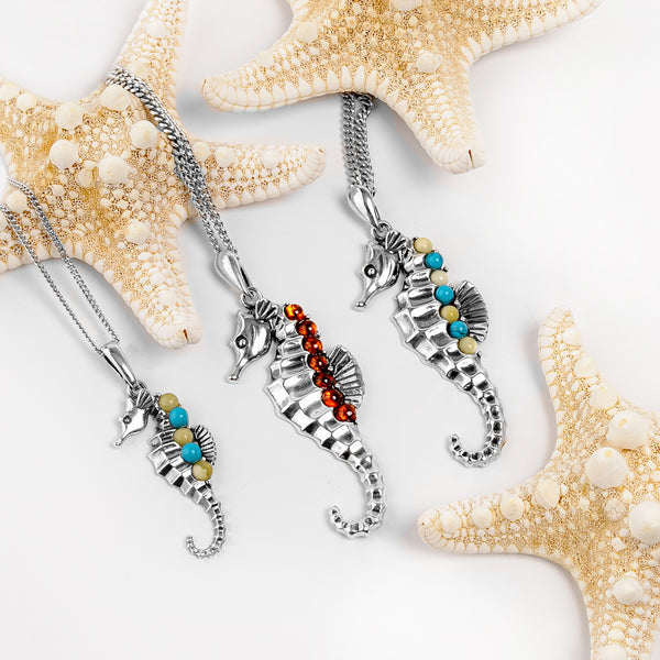 A symbol of the sea, our Large Silver, Amber, and Turquoise Seahorse Necklace will remind you of happy days at the beach.