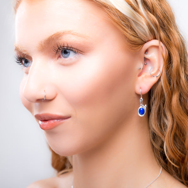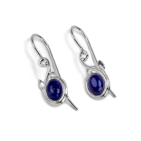 Crafted in 925 silver, each earring is adorned with an oval natural blue Lapis Lazuli gemstone encased in silver with leaf detailing decorating the outside. Finished with a solid silver hook for comfortable all day wearing.