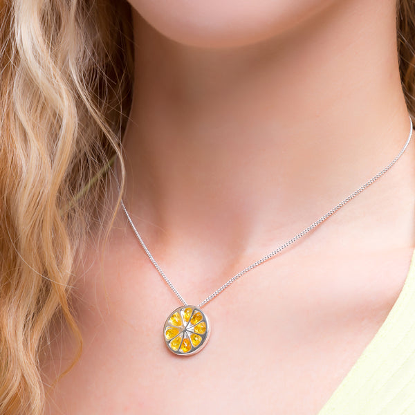Crafted in 925 silver and embellished with 8 individual genuine Baltic Yellow Amber gemstones to create the lemon slice design. Complete with a silver chain, its the perfect summer accessory.
