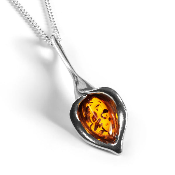 Handcrafted in 925 Sterling Silver and adorned with a single genuine Baltic Amber gemstone representing the bud of the opening flower. This captivating pendant is instantly recognisable as the 'Calla Lily' which is a popular member of the Lily family. Complete with a solid silver chain, it will sit perfectly on the neckline.