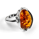 Handcrafted in sterling silver, this contemporary designed ring has an oval shaped genuine Baltic Amber gemstone which is encased in a filigree silver mount. A perfect statement ring that can be worn solo or to compliment your other Amber jewellery.