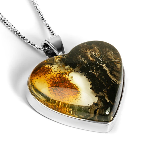 This stunning heart shape genuine Baltic Amber gemstone is a truly rare find. The stone is highly polished which showcases the unusual natural inclusions inside the Amber. Finished with a solid silver chain, it is a bold and beautiful statement pieces every jewellery lover needs.