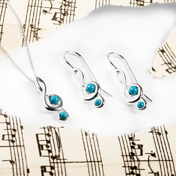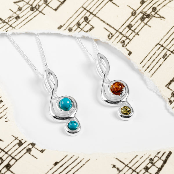 Dedicated to the art of music, this Silver and Turquoise Treble Clef Necklace is a great way to signify your hobby and passion.