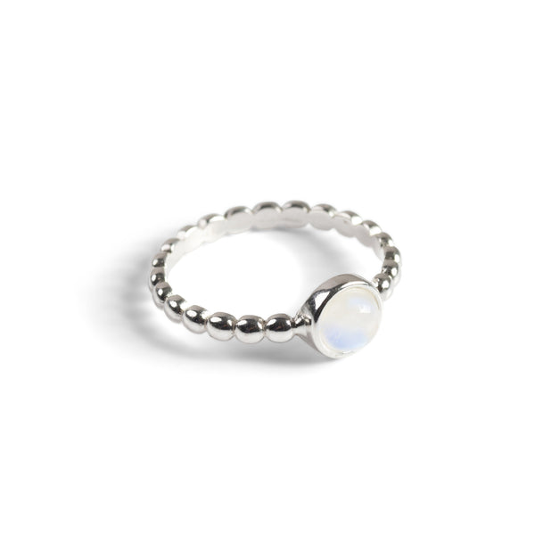 Add a splash of colour to your repertoire with our Silver and Moonstone Round Charm Bead Ring.