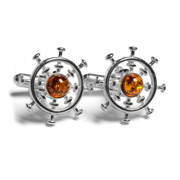Ahoy there! Our stylish silver Ship Wheel Cufflinks are ideal for someone who likes to be out on the waves. Handcrafted in solid silver with Baltic Amber gemstone this pair of ship wheel shaped cufflinks are sure to become a favourite suit accessory.