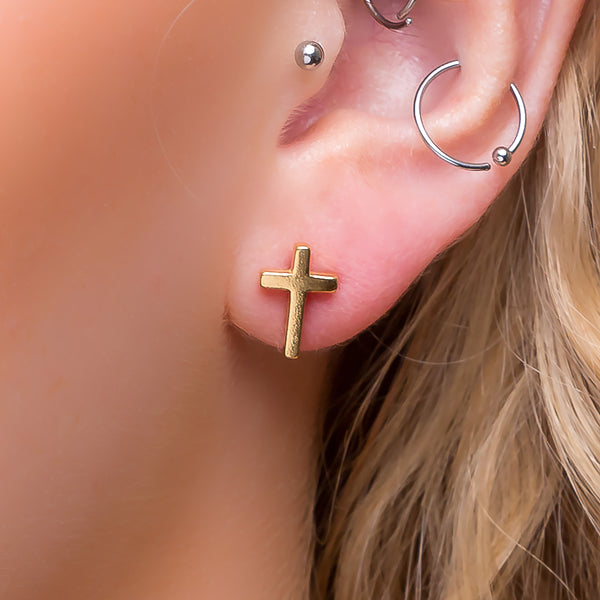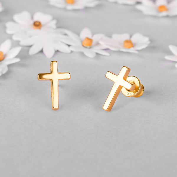 Simple Cross Stud Earrings in Silver with 24ct Gold