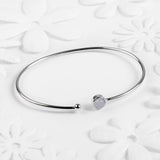 Handcrafted in 925 Sterling Silver, this solid cuff bangle is adorned with a single round natural Blue Lace Agate stone at one end and a fixed silver ball at the other. With an easy open slip on style which can be adjusted to fit, it is comfortable and secure to wear. Cleverly handmade, this bangle will always look pristine and keep its shape.