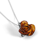This unique jewellery piece has a carefully carved genuine Baltic Amber gemstone Rose flower which is set onto a handcrafted 925 Sterling Silver bud setting. Complete with a solid silver chain.