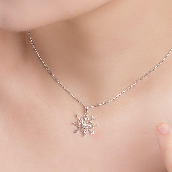 Handcrafted in 925 sterling silver, this carefully designed snowflake is full of intricate detailing to make this ice crystal really stand out. Finished with a sparkling white Cubic Zirconia stone to make it really shine. Complete with a solid silver chain, it will add a touch of winter glamour to your outfit.
