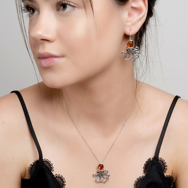 Beautifully crafted in solid 925 silver and adorned with a large genuine Baltic Amber gemstone in the head of the Octopus. Finished with amazing detailed tentacles, this necklace is ideal for anyone who loves quirky jewellery.