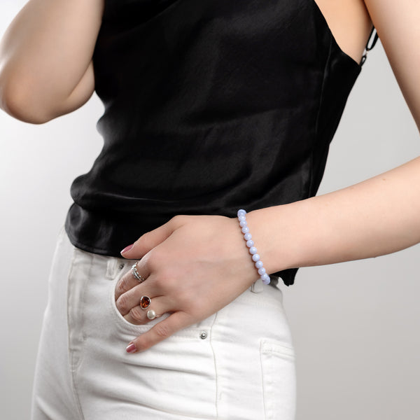 Made up of perfectly rounded pretty Blue Lace Agate gemstone beads on a strong nylon string, this bracelet can be worn solo or layer up with your favourite accessories.