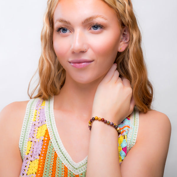 Made up of perfectly rounded natural Mookaite Jasper gemstone beads on a strong nylon string, this bracelet can be worn solo or layer up with your favourite accessories.