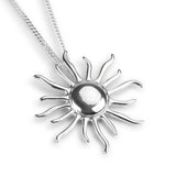 Crafted in 925 silver and 24ct Gold plating with carefully shaped waved sun beams surrounding a solid silver centre. You can now feel radiant all year around. Complete with a silver gold plated chain, it is the perfect size to layer with your favourite necklaces.