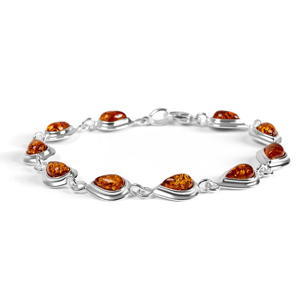 Handcrafted in solid 925 silver, this bracelet is adorned with 11 genuine Baltic Amber gemstones which have been carefully cut and polished into a teardrop shape. Each stone is set and linked together in silver.